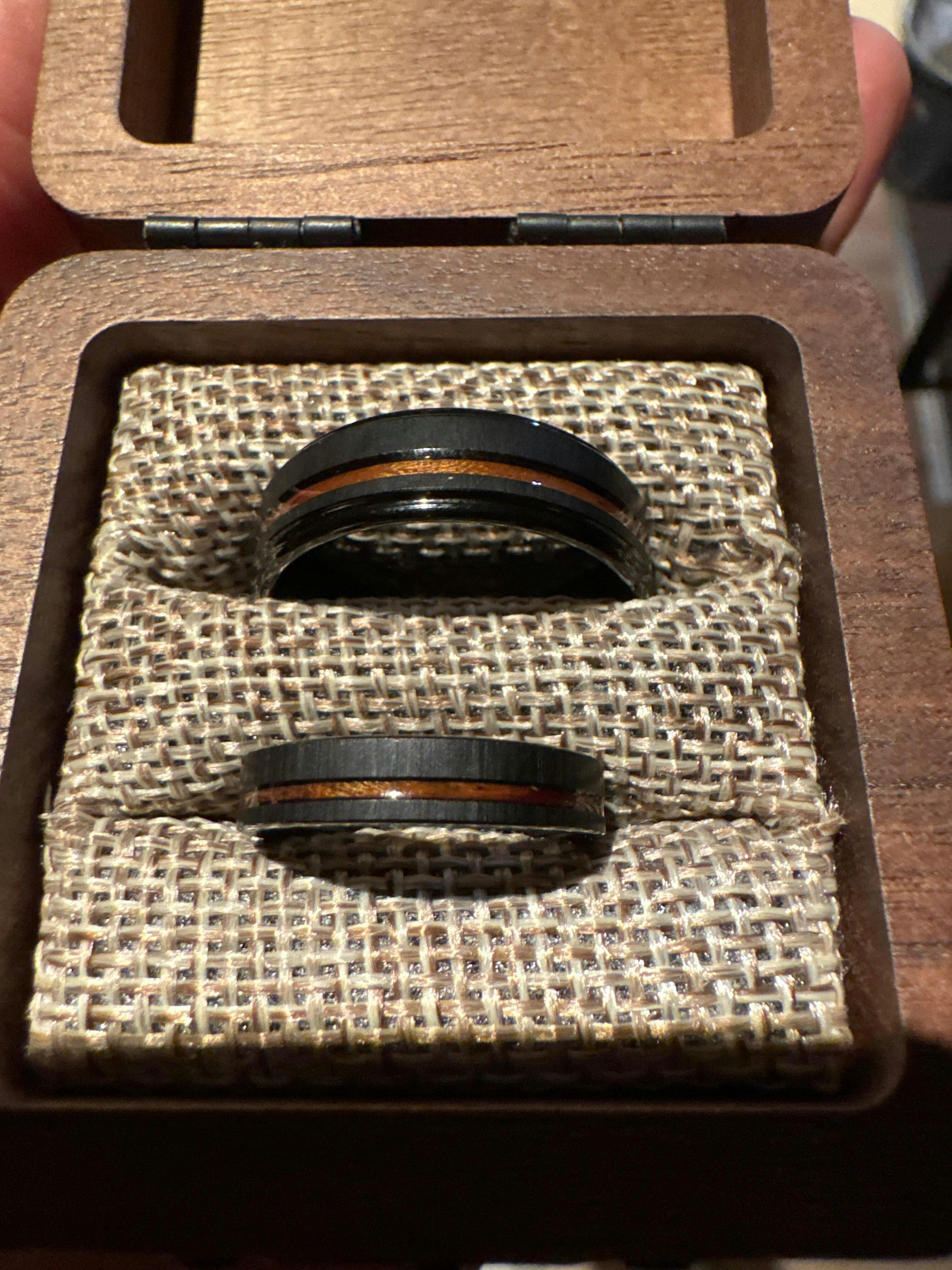 Das Velor Partnerring-Set kombiniert tiefes Schwarz mit einer feinen Holzeinlage – für Paare, die klare Formen und echte Materialien lieben.